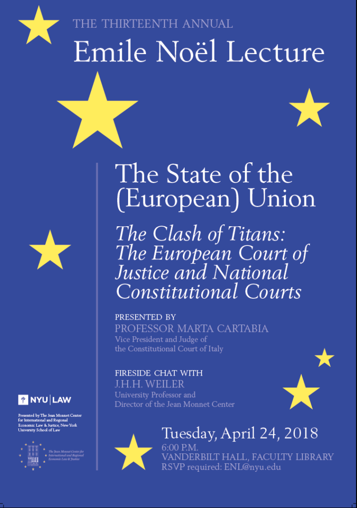 The Jean Monnet Center for International and Regional Economic Law & Justice at NYU School of Law hosted the Thirteenth Annual Emile Noël Lecture on the State of the (European) Union on Tuesday, 24 April 2018. This year’s lecture “The Clash of Titans: The European Court of Justice and National Constitutional Courts” was presented by Professor Marta Cartabia, Vice-President and Judge of the Constitutional Court of Italy. The lecture was presented as a Fireside Chat between Judge M. Cartabia and J.H.H. Weiler, University Professor and Director of The Jean Monnet Center.