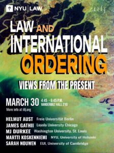 The Institute for International Law and Justice invites you to a timely conversation on the changing state of international governance amid escalating conflict in various world regions, the growing entanglement of corporate actors as well as the rapid integration of artificial intelligence into domestic security and geopolitical strategy. The talk explores how these developments are reshaping authority, accountability, and power across public, private, and hybrid domains. Yet it also highlights a quieter continuity: despite public contestation and political strain, many institutionalized systems of ordering — and the everyday practices of cooperative governance — continue to sustain much of contemporary globalized life.